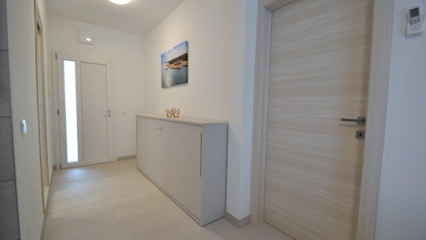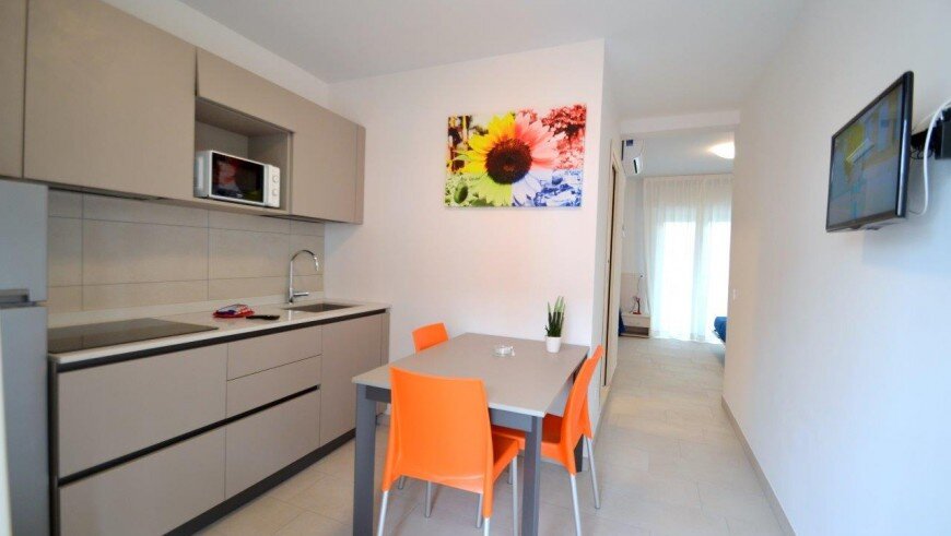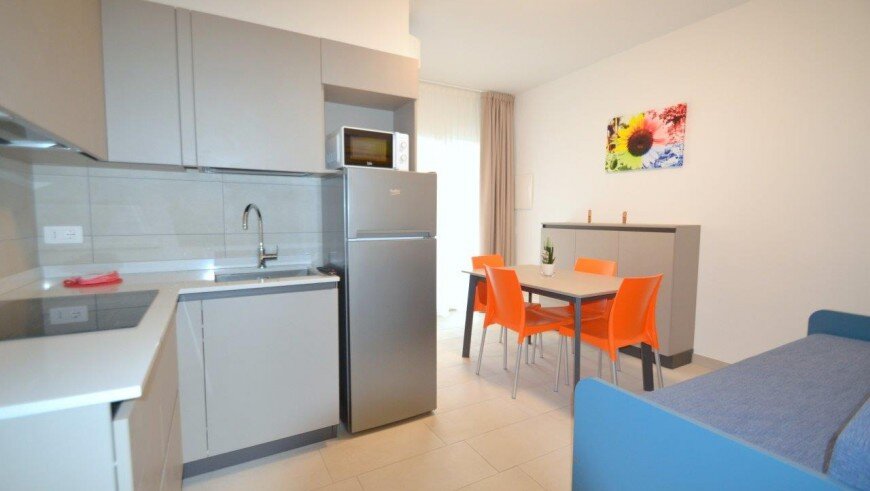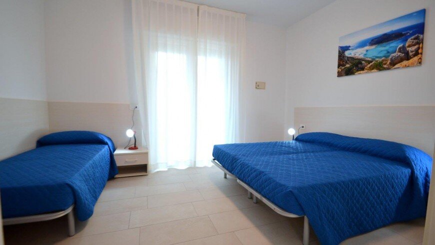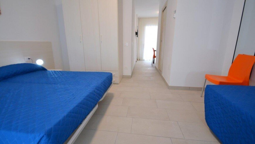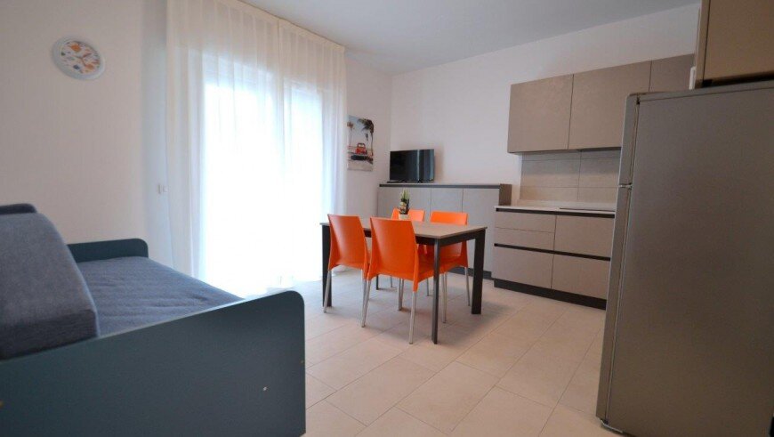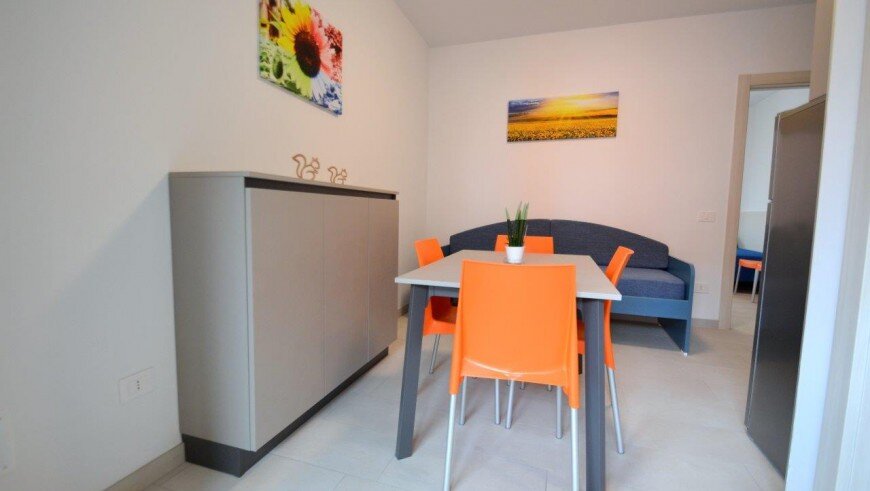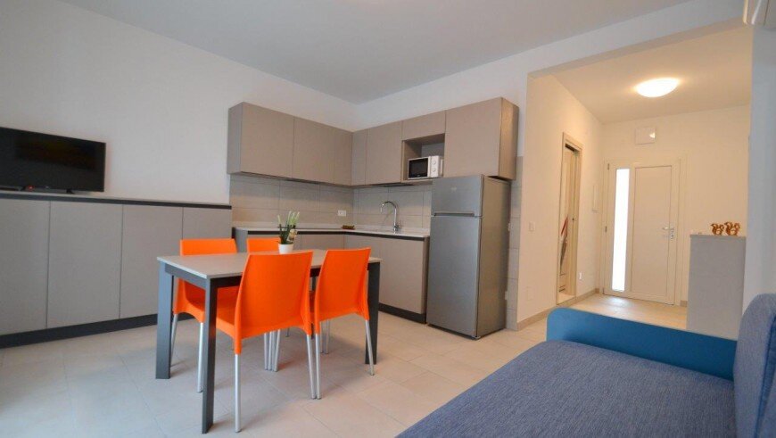 v dome bez výťahu sa nachádza niekoľko typov apartmánov. Všetky sú moderne zariadené, majú obývaciu miestnosť vybavenú kuchynským kútom a pohovkou, k dispozícii je trezor, chladnička, plynový sporák, mikrovlnná rúra, spoločná práčka, TV, klimatizácia a balkón. Apartmán pre max. 6 osôb - trilocal C - má navyše dve spálne - jednu s dvojlôžkom a samostatným lôžkom, druhú s dvomi samostatnými lôžkami. Apartmány pre max. 3 osoby - typy B - majú ešte jednu spálňu s dvojlôžkom a samostatným lôžkom - v obývacej miestnosti sa nenachádza pohovka. Apartmány pre max. 4 osoby - typy B1 - majú ešte jednu spálňu s dvojlôžkom a samostatným lôžkom. Apartmány pre max. 5 osôb - typy B 2- majú ešte jednu spálňu s dvojlôžkom a samostatným lôžkom a v obývacej časti pohovku pre dve osoby.