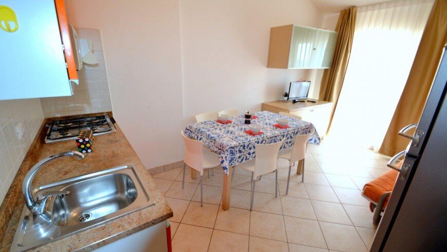 v dome je výťah, všetky apartmány maju klimatizáciu v cene, zrenovované kúpeľne so sprchovacím boxom a kuchynskú linku, vybavenú chladničkou, mikrovlnnou rúrou a plynovým sporákom. V obývacej izbe je TV, jedálenský kút a gauč pre dve osoby, v spálni je bud dvojlôžko ( v type B1 pre max. 4 osoby) alebo dvojlôžko a jedno samostatné lôžko (v type B a type B2 pre max. 5 osôb). Všetky typy majú balkón, typ B2 je na poslednom poschodí s veľkým balkónom a výhľadom na more. Dom nemá vlastné parkovacie miesta, klienti majú v cene pobytu parkovaciu kartu na celý pobyt bez určenia konkrétneho parkovacieho miesta, ktoré si nájdu v okolí domu. Odporúčame pre klientov cestujúcich autobusovou dopravou.