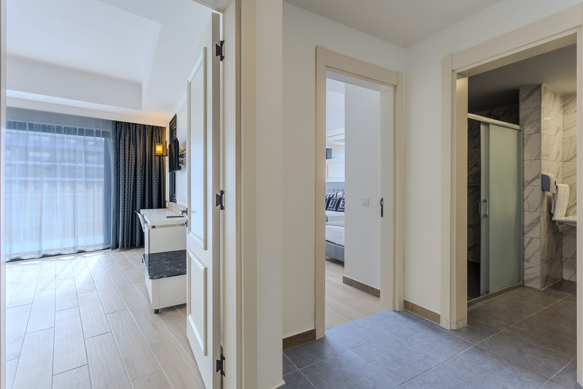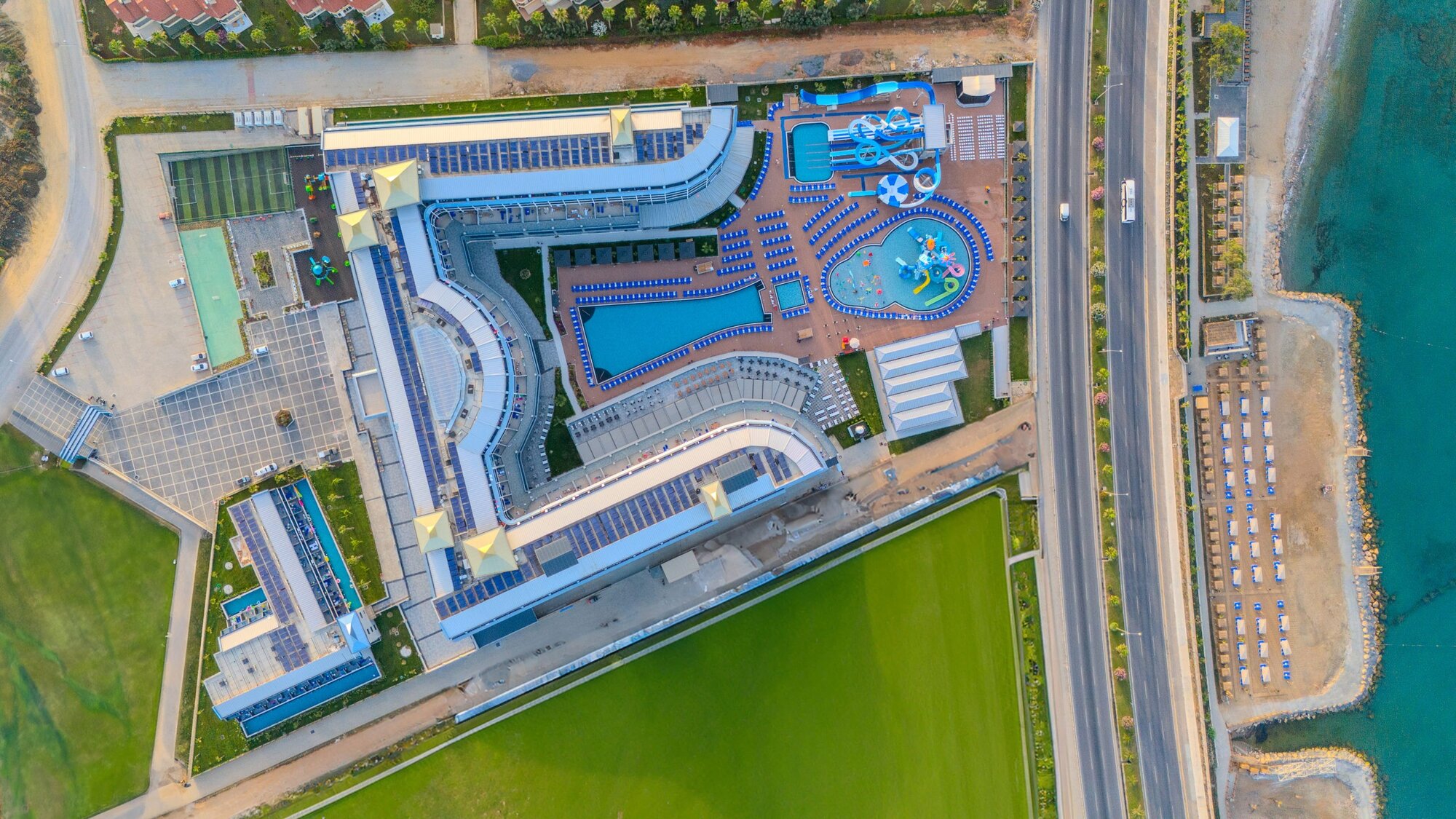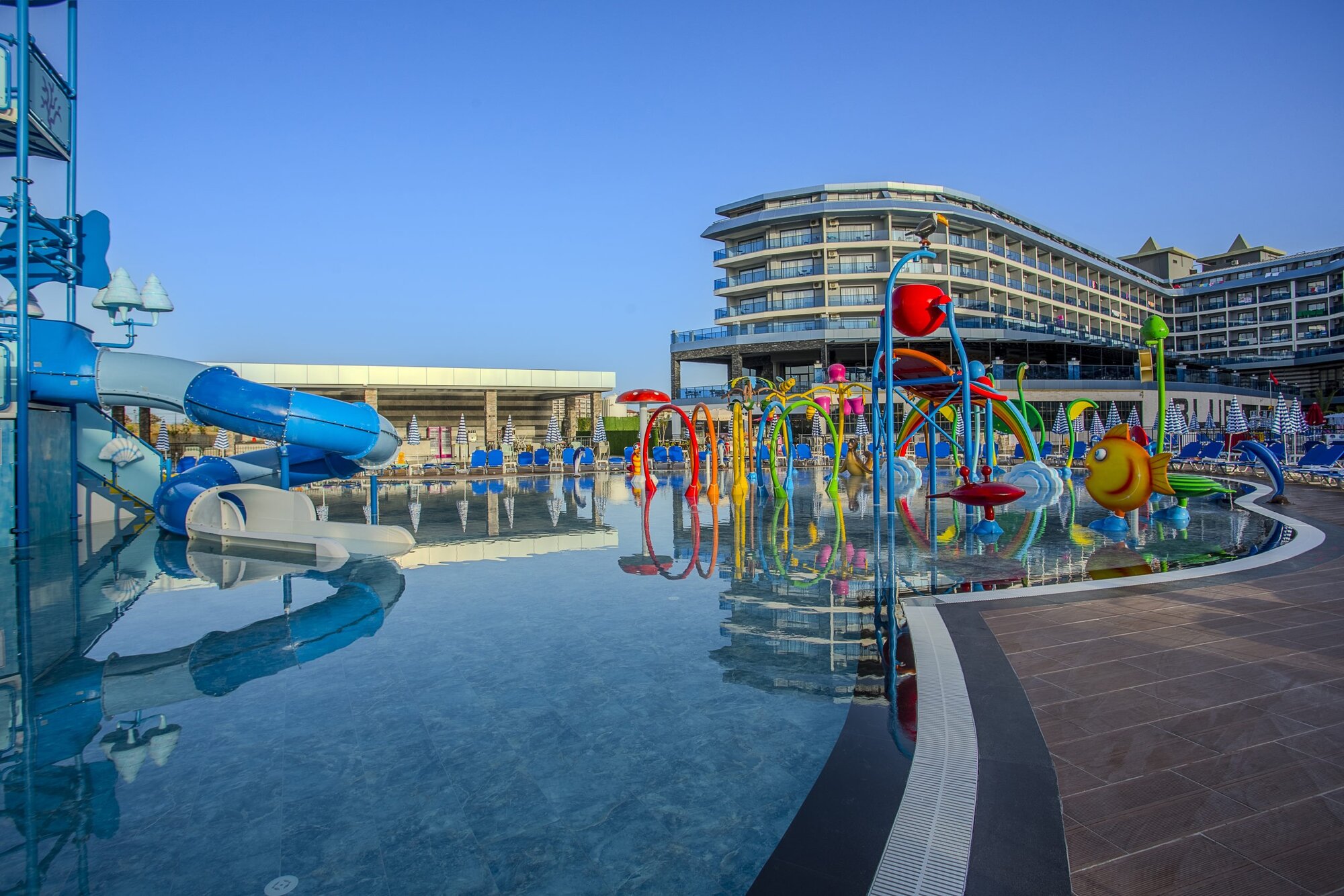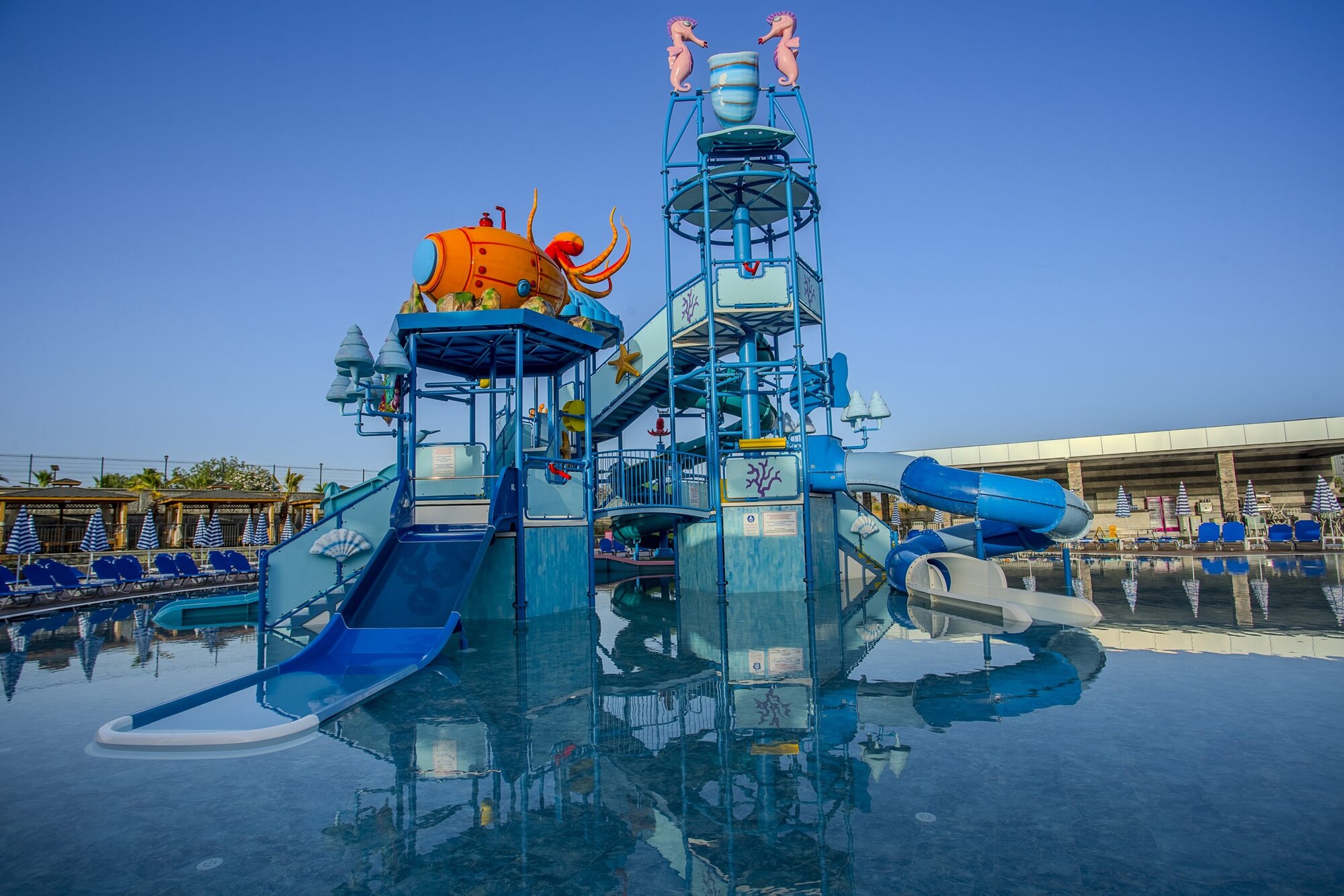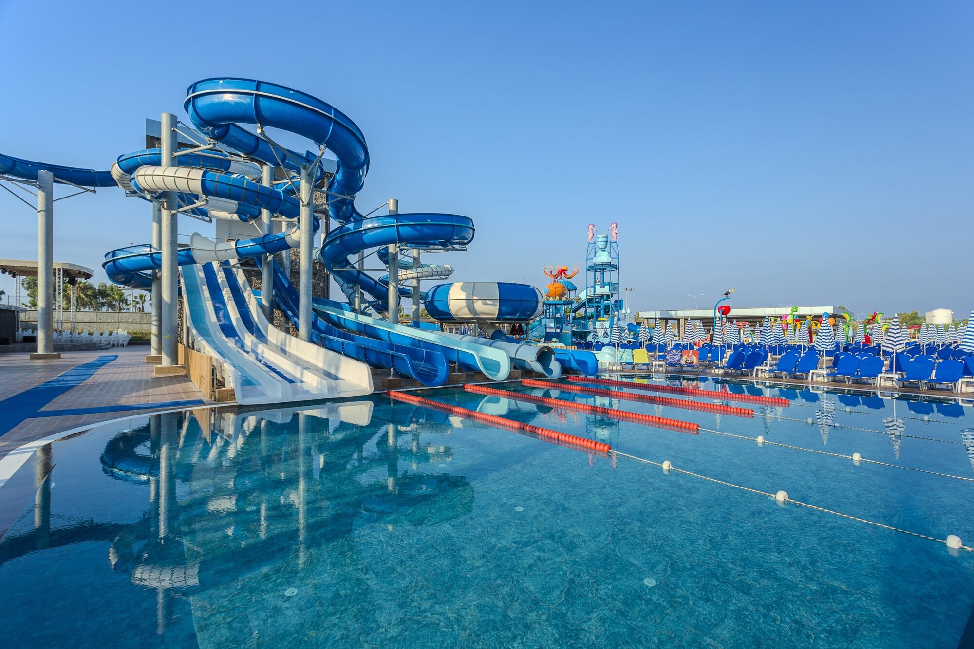 - vonkajší bazén s ležadlami a slnečníkmi, bazén so 7 šmykľavkami, detský bazén, detský aquapark so šmykľavkou