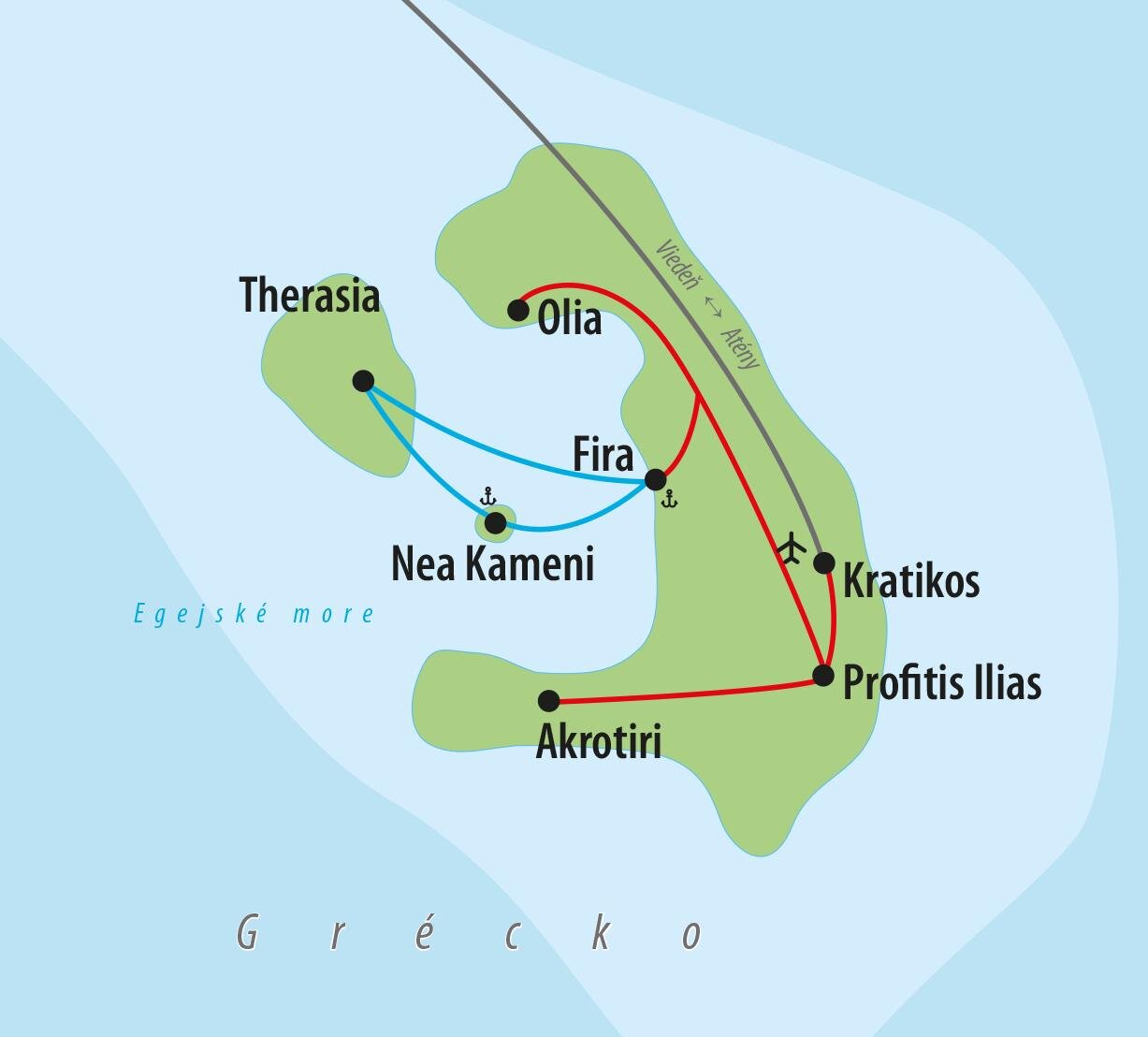 Prílet na ostrov Santorini, ktorý je známy