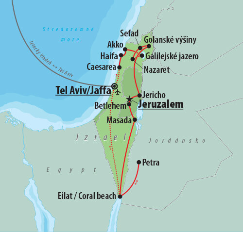 Nezabudnuteľný zážitok si odnesiete z poznávacieho zájazdu Izrael a Petra. Nevynecháme najväčšie atrakcie, ako sú Jeruzalem s Getsemanskou zájhradou, Olivovú horu, Baziliku všetkých národov, Tel Aviv, Betlehem s jaskyňou, kde sa narodil Ježiš Kristus, mesto Nazaret, vezmeme vás na plavbu po Galilejskom jazere, okúpete sa v Mŕtvom mori a navštívite slávne skalné mesto Petra v susednej krajine Jordánsko. Ubytovanie: 9x ubytovanie Stravovanie: 9x polpenzia Caesarea - Haifa - Akko - Galilejské jazero - Nazaret - Sefad - Golanské výšiny - Jericho - Jeruzalem - Betlehem - Masada - Eilat -  Petra - Coral beach - Tel Aviv/Jaffa Izrael: PODMIENKY VSTUPU DO KRAJINY Jordánsko: PODMIENKY VSTUPU DO KRAJINY Program