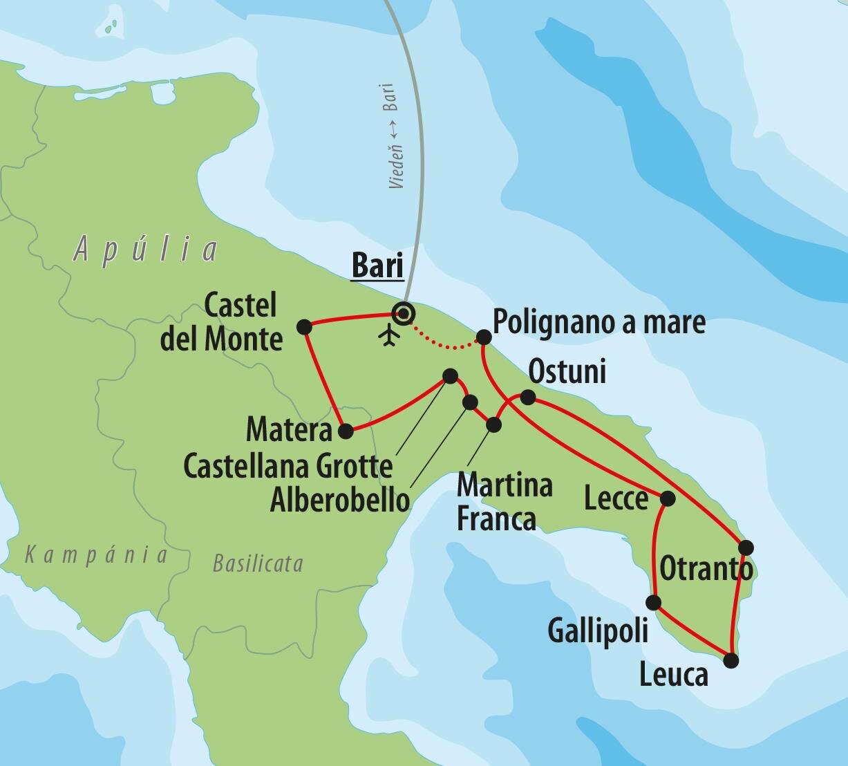 Raňajky, individuálne voľno na oddych či kúpanie, v prípade záujmu návšteva mestečka Polignano a Mare alebo mesta Bari. Nocľah.
