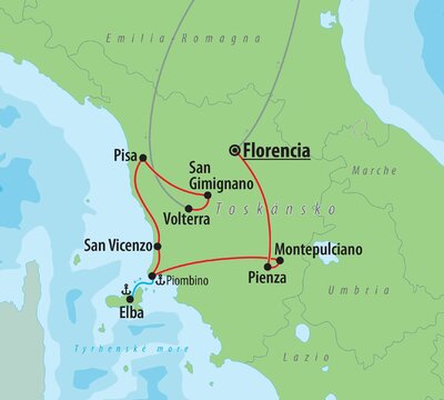 nálady. Prepojenie najkrajších miest Toskánska ako Pisa, Florencia, ostrov